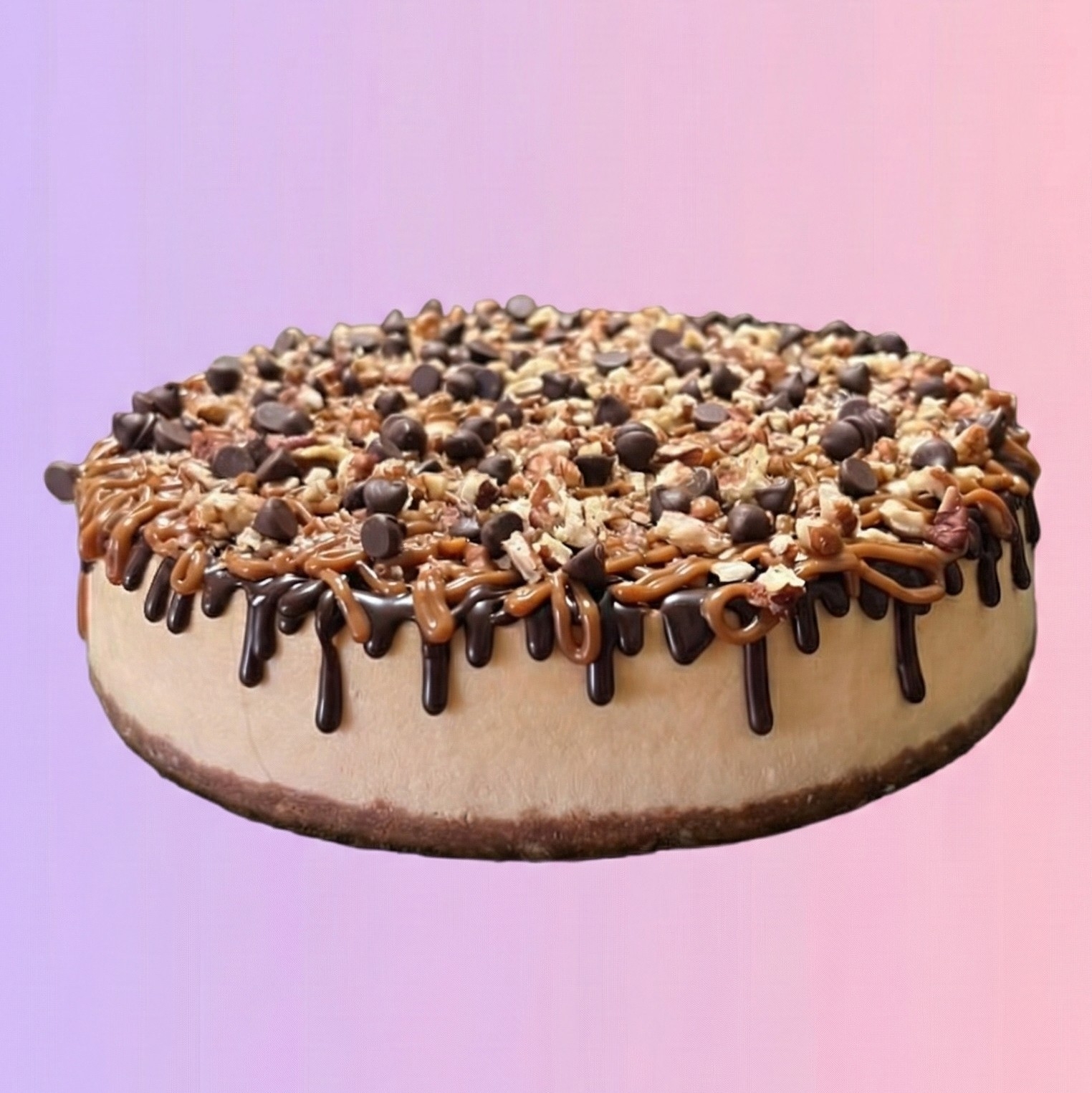 Cremoso cheesecake cubierto de ganache de chocolate, dulce de leche y nuez /18cm diámetro/6-8 porciones
