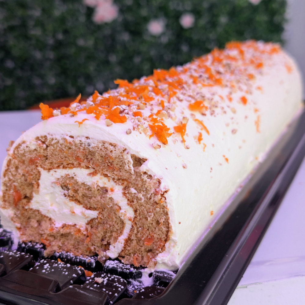 Rollo suavecito de zanahoria, relleno y cubierto de mezcla a base de queso crema /40cm largo/12-16 porciones