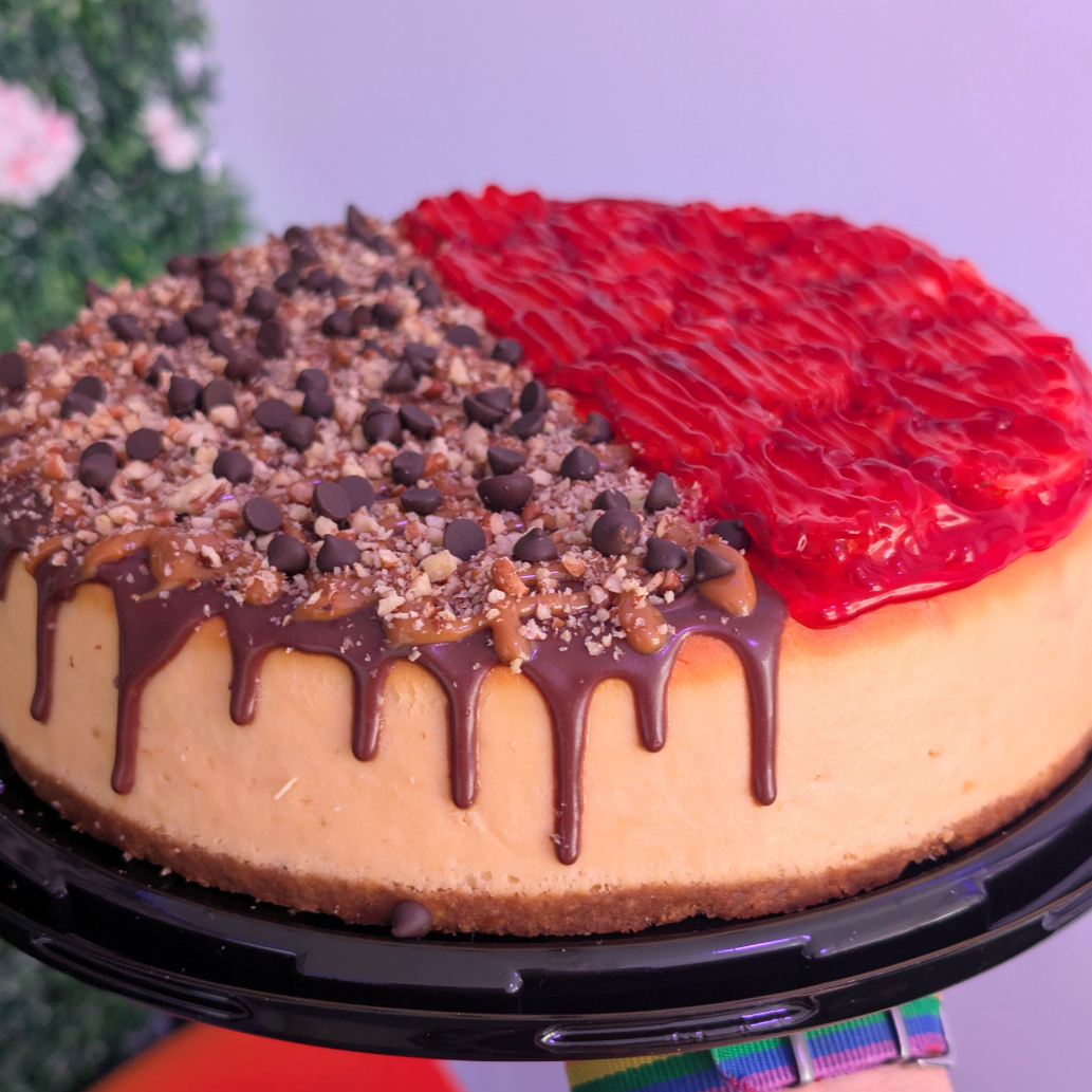 Cremoso cheesecake mixto, mitad tortuga y mitad fresa picada y glass/24cm diámetro/10-14 porciones