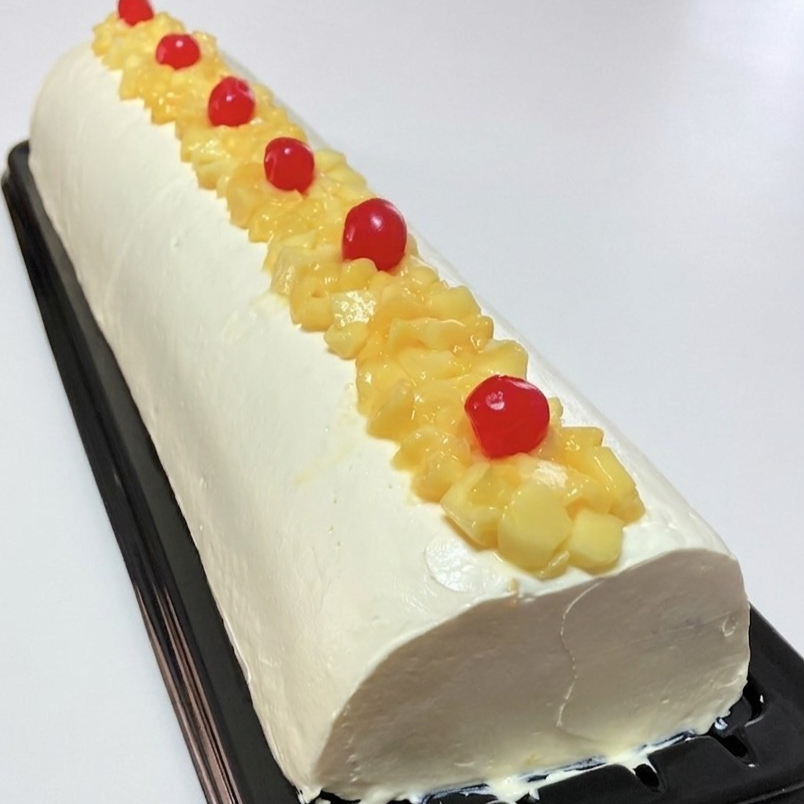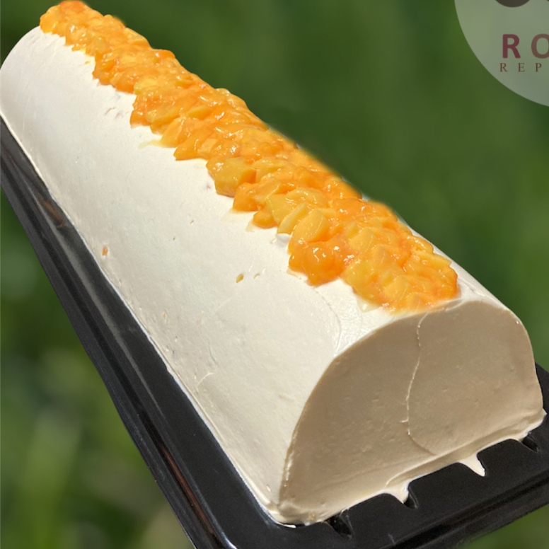 Rollo suavecito relleno de crema con yogurt y cubierto de mango/20cm de largo/4-8 porciones