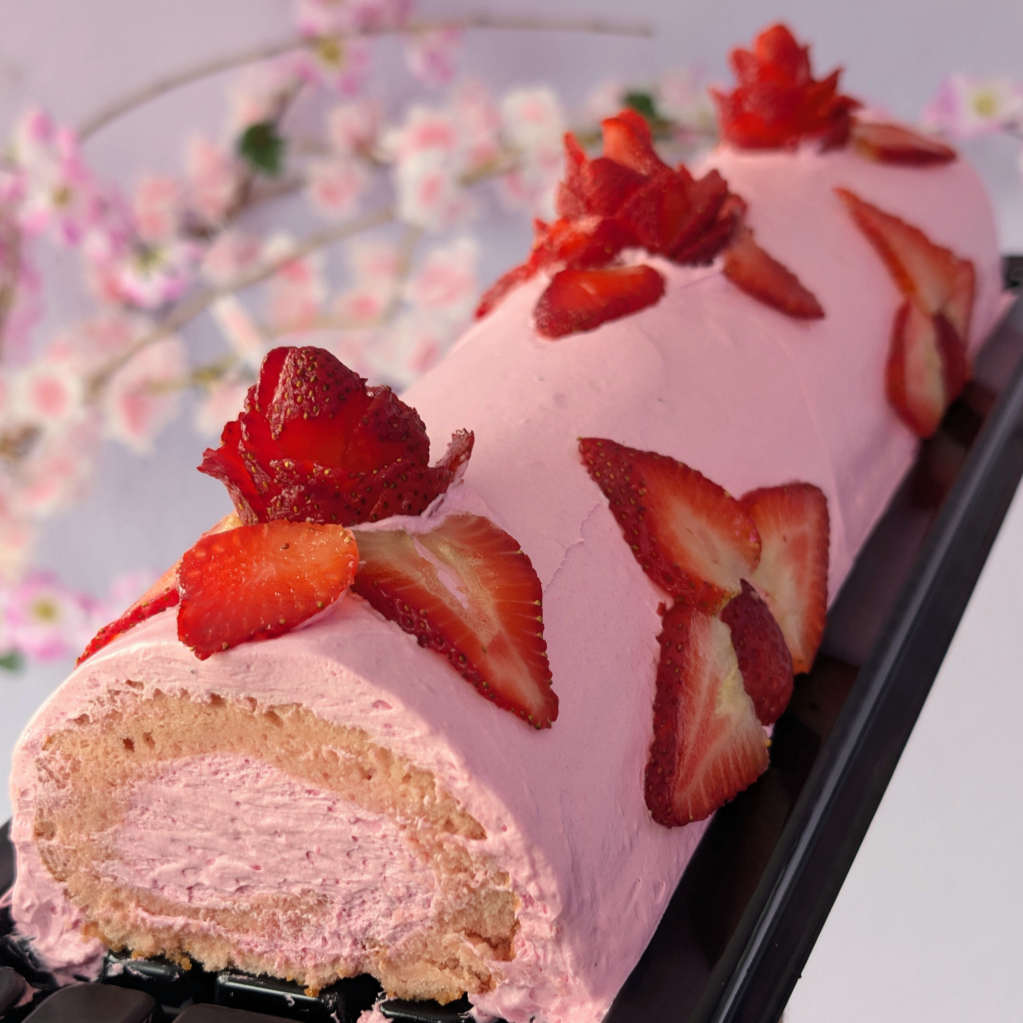 Rollo suavecito relleno de crema con yogurt y cubierto de fresas, tamaño mediano/30cm de largo/9-12 porciones
