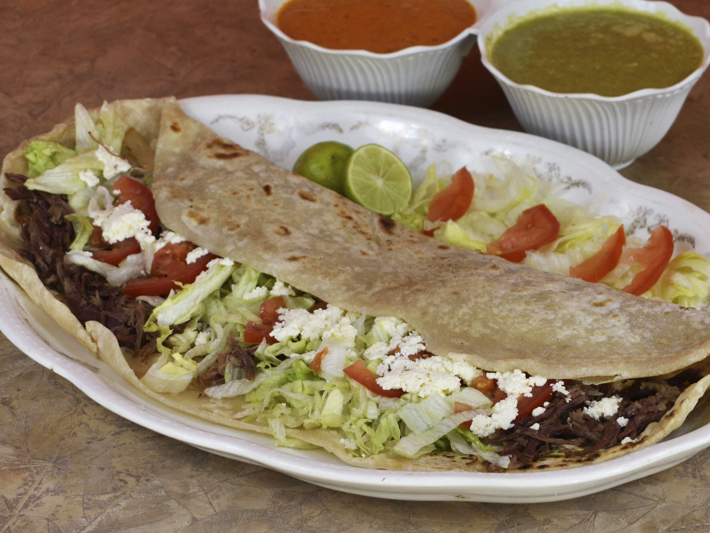 Tortilla de Harina + Lechuga + Tomate + Deshebrada + Bolsita de Salsa Verde