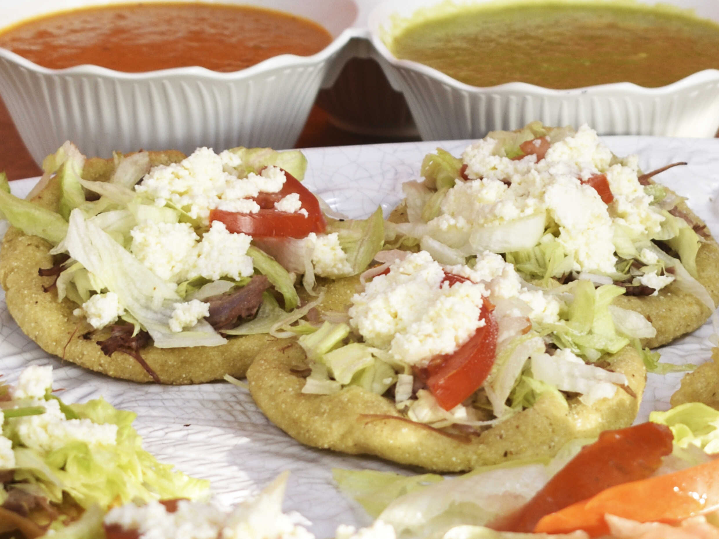3 sopes de desebrada con frijoles, lechuga, tomate, queso fresco + bolsita de salsa y bolsita de crema.