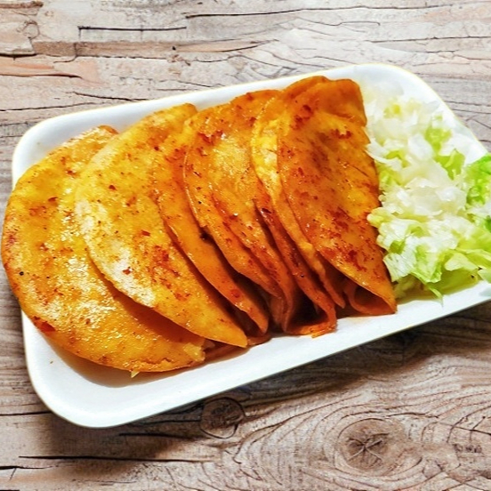 6 Tacos rojos (3 tacos de Desebrada y 3 de frijol) con lechuga y 1 bolsita de salsa.