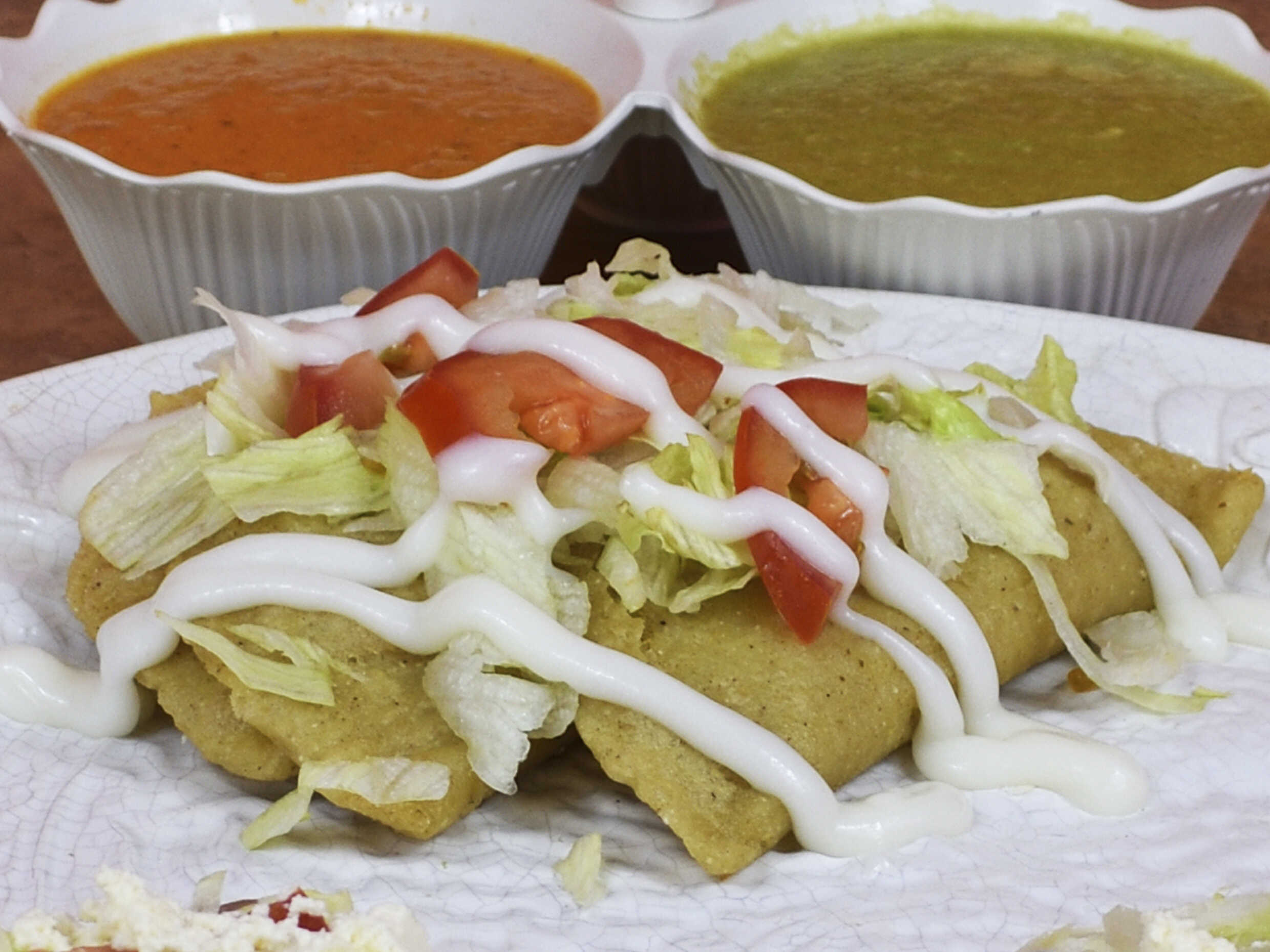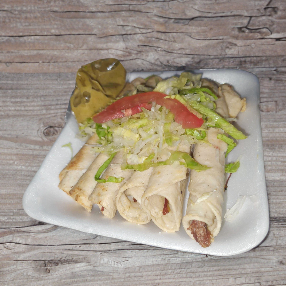 6 Flautas de carne de deshebrada con lechuga, tomate y 1 bolsita de crema+ 1 bolsita de salsa. Flautas termino medio, doradas o suaves.