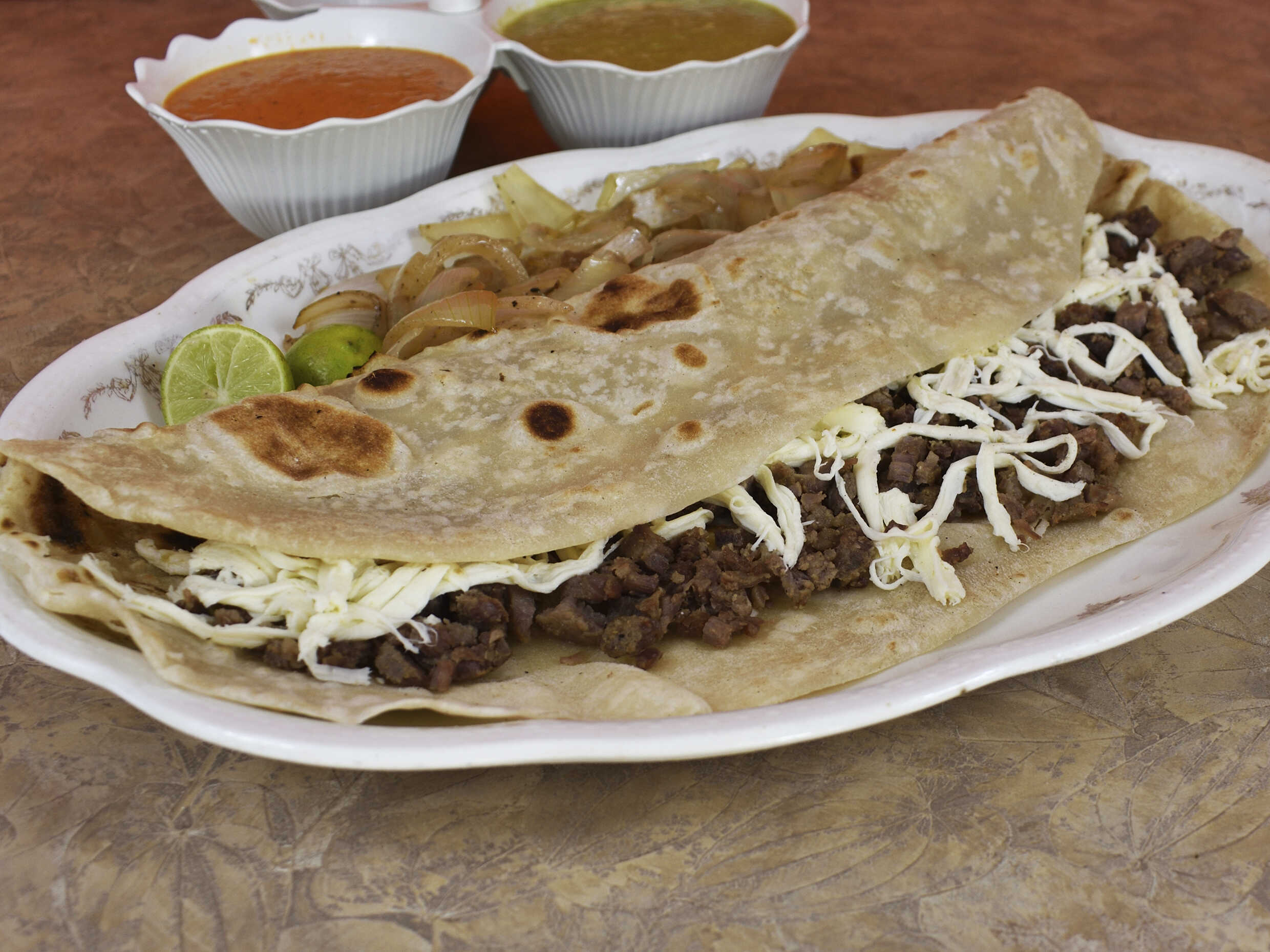 Tortilla de harina + Bistec + Queso asadero + bolsita de salsa verde