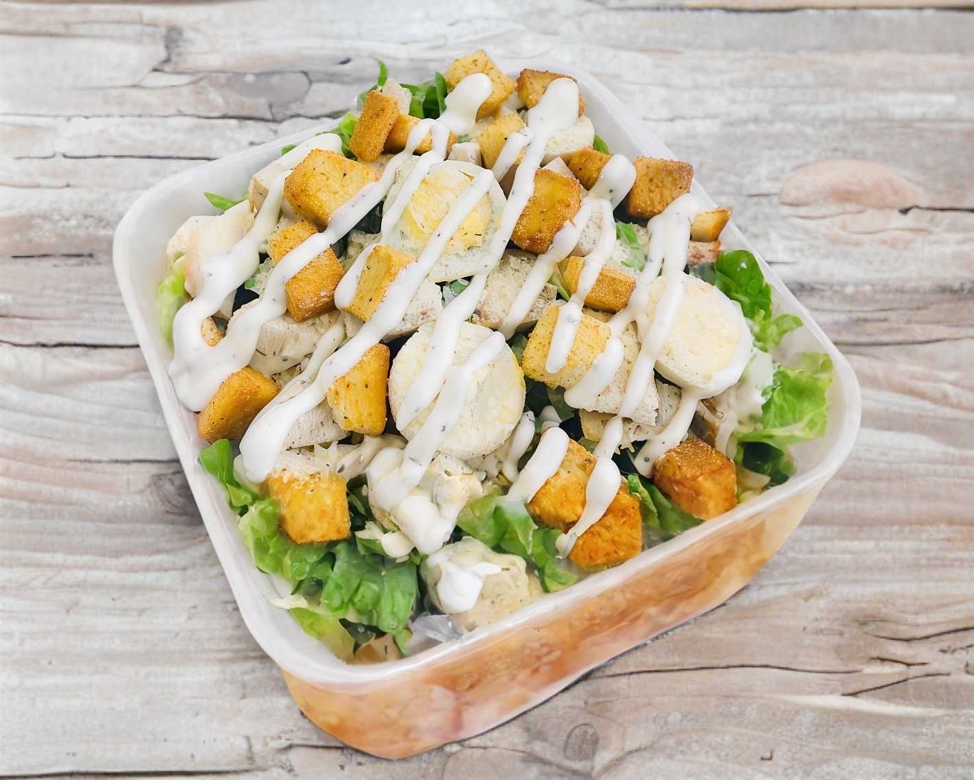 Lechuga, pechuga de pollo, aguacate, huevo cocido, queso parmesano, aderezo ranch y crotones