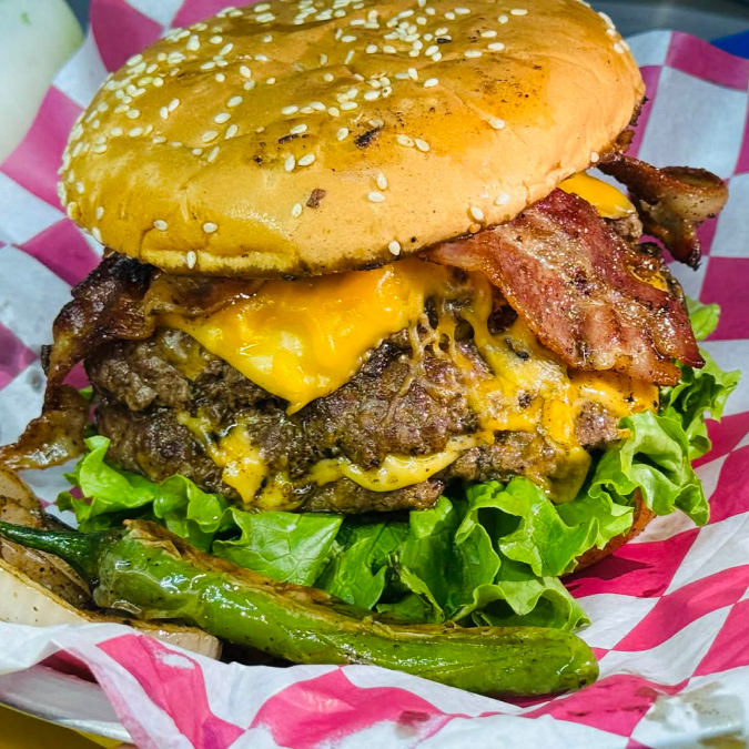 DOUBLE CARNE 100% BLACK ANGUS, QUESO AMARILLO, LECHUGA, CEBOLLA ASADA, TOCINO Y JALAPEÑO TOREADO, PEPINILLOS TOMATE, MOSTAZA, MAYONESA, CATSUP Y ORDEN DE PAPAS FRITAS.