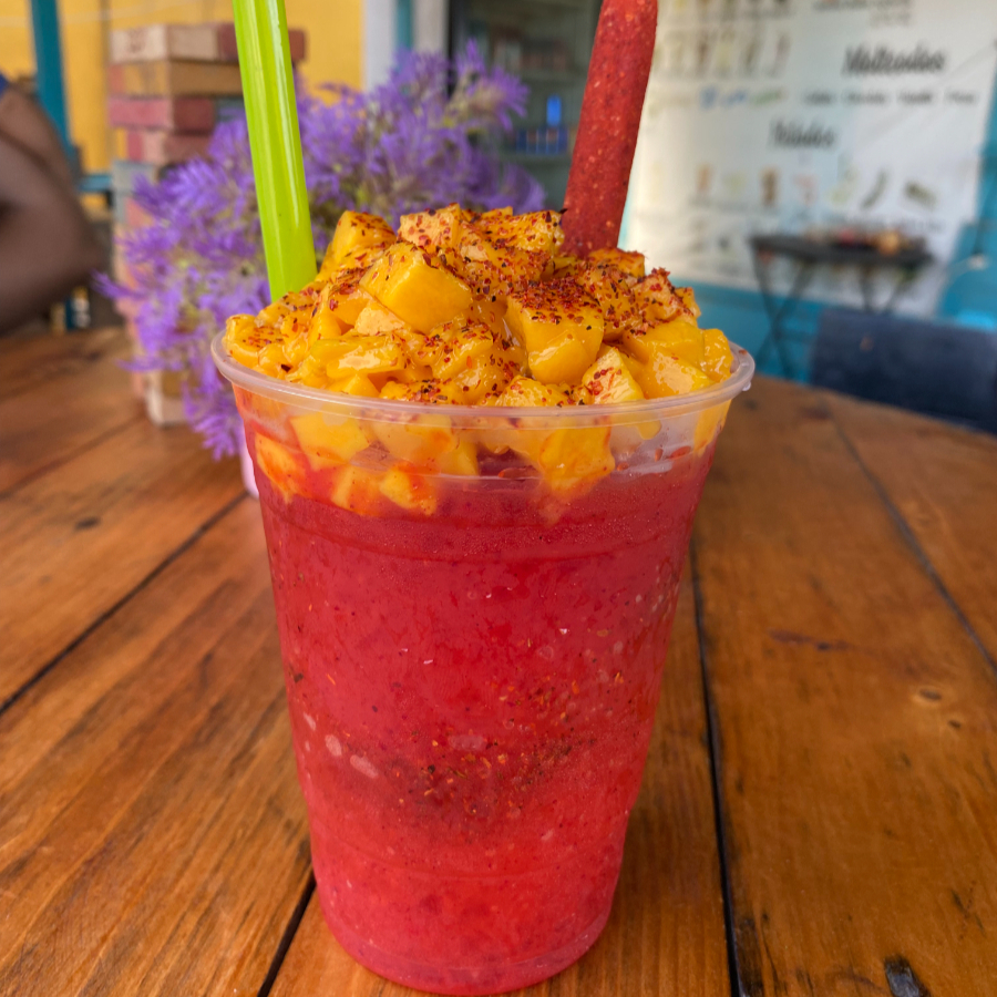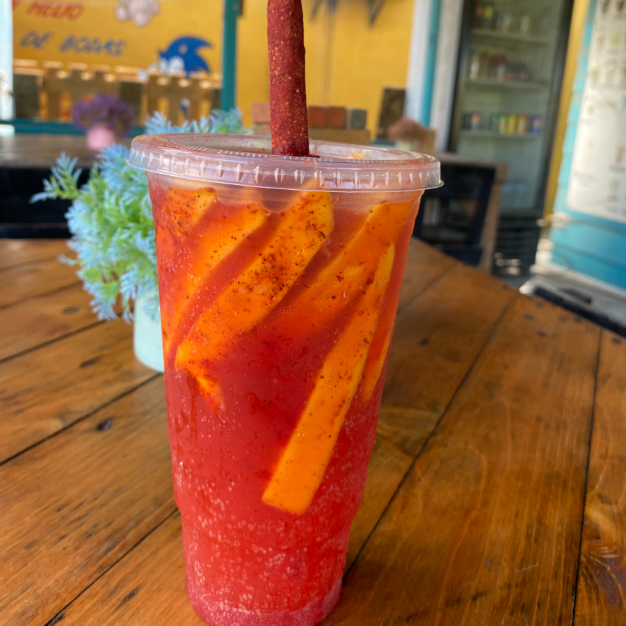 Refresco de toronja con hielo triturado acompañado de chamoy y chilito. 150g mango 32oz.