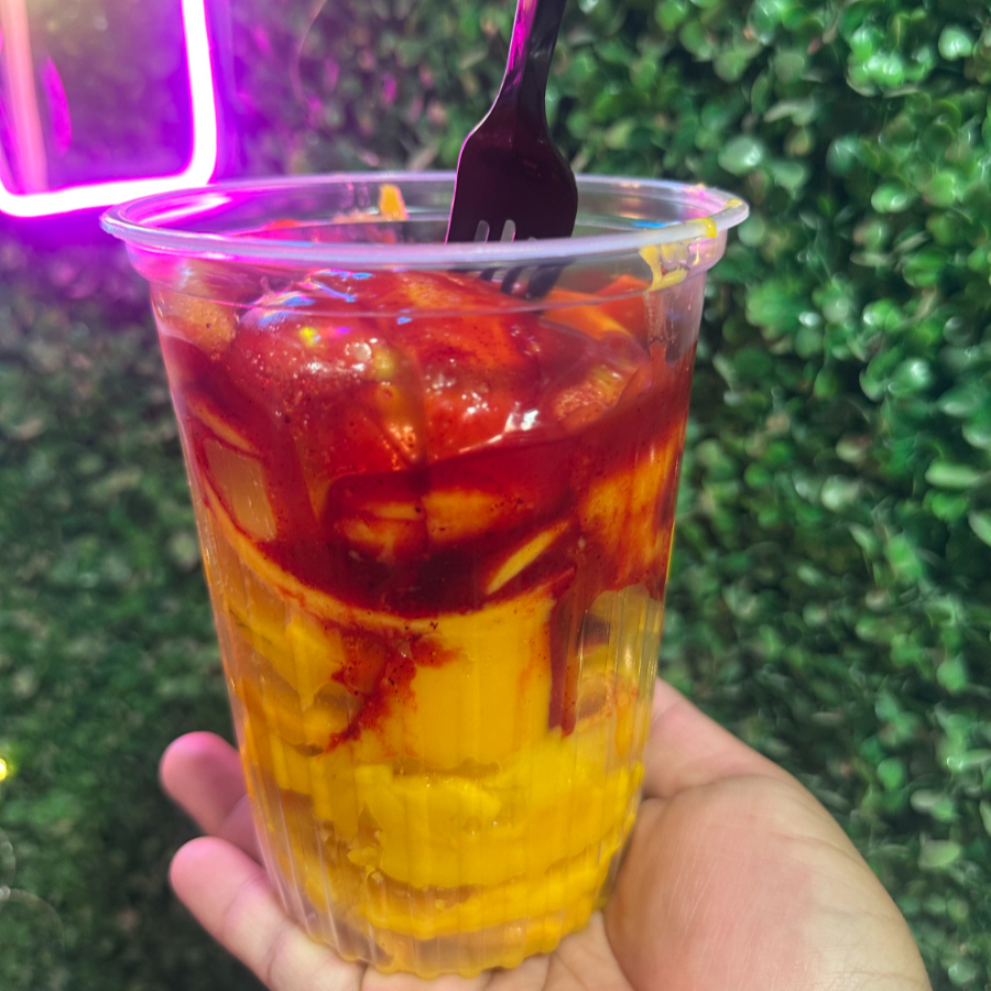 Vaso de hielo triturado con chamoy chilito y limón. En la parte superior mango 16oz.