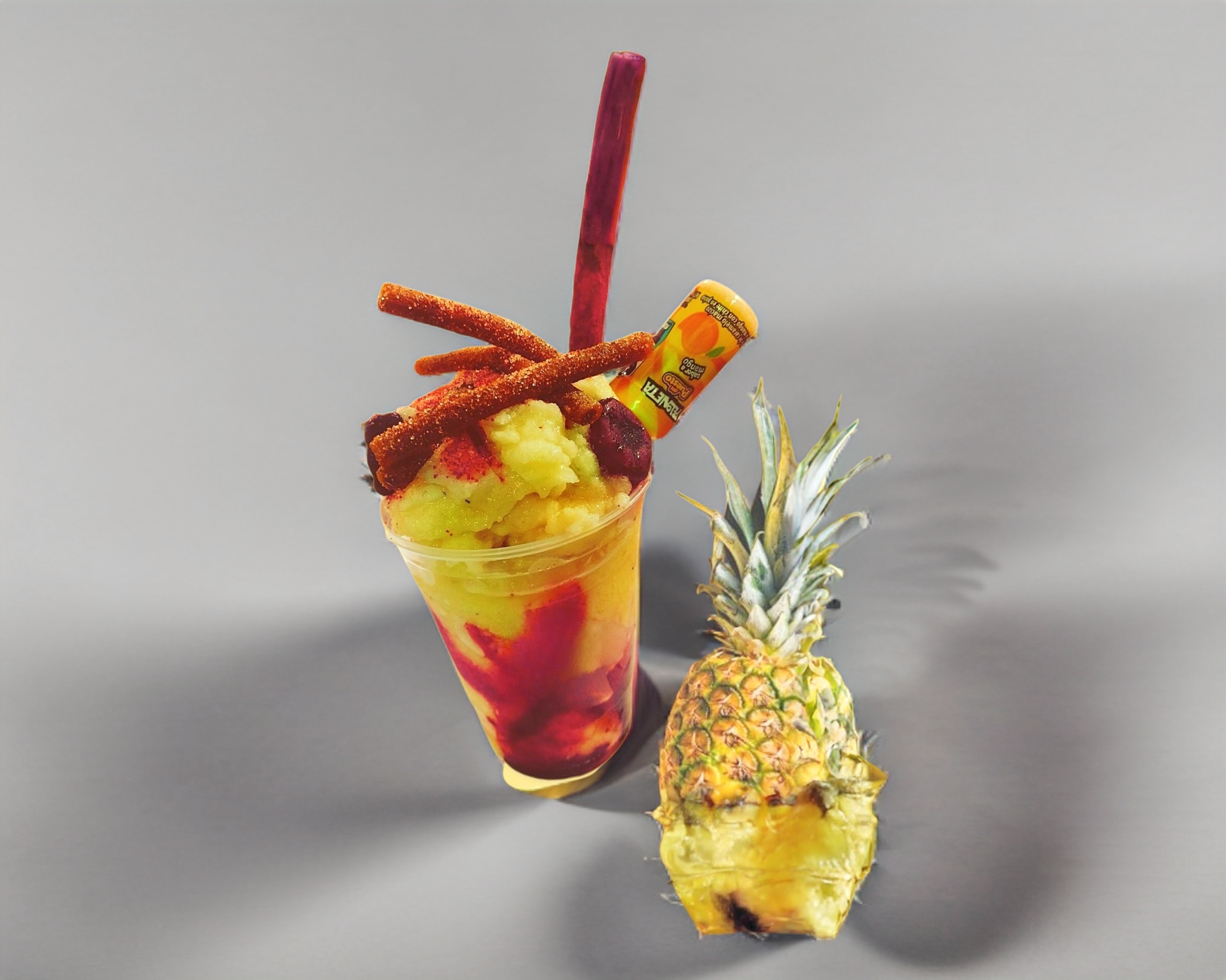 Fruta natural, skwinkle clasico, gomi piña enchilada, pelón pelo rico y banderilla de tamarindo. Envase de 16 OZ .