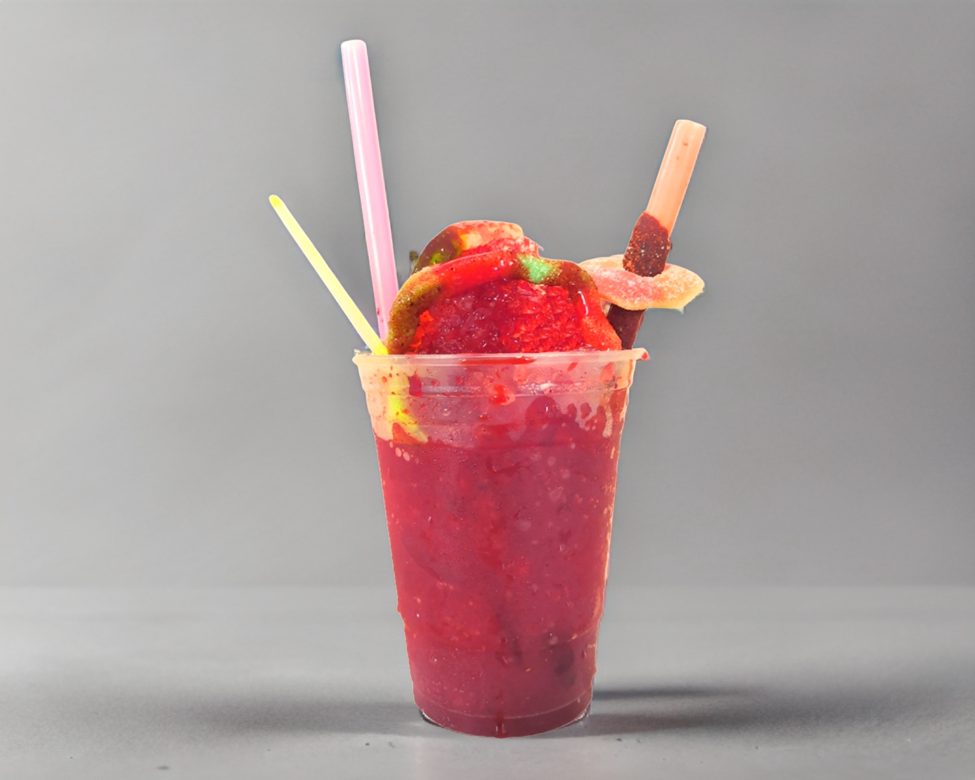 Chamoy preparado 1/2 litro. trae fruta, 4 gomitas de lombriz, 5 gomitas de pandita, dona de gomita, tarugo (banderilla de tamarindo), cuchara y popote.(El vaso No es de 1 litro ni de litro 1/2)