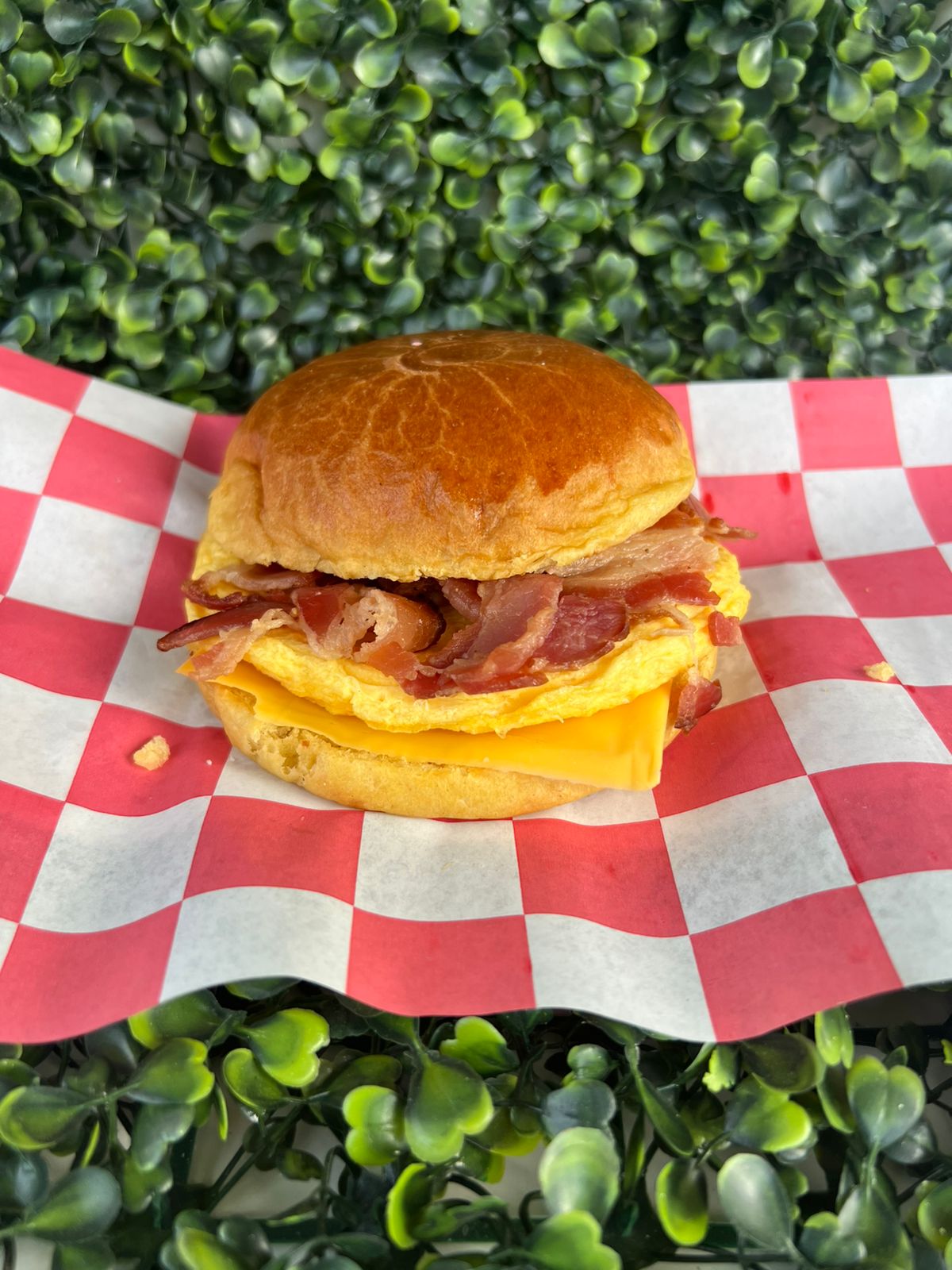 Tocino, huevo y queso americano.