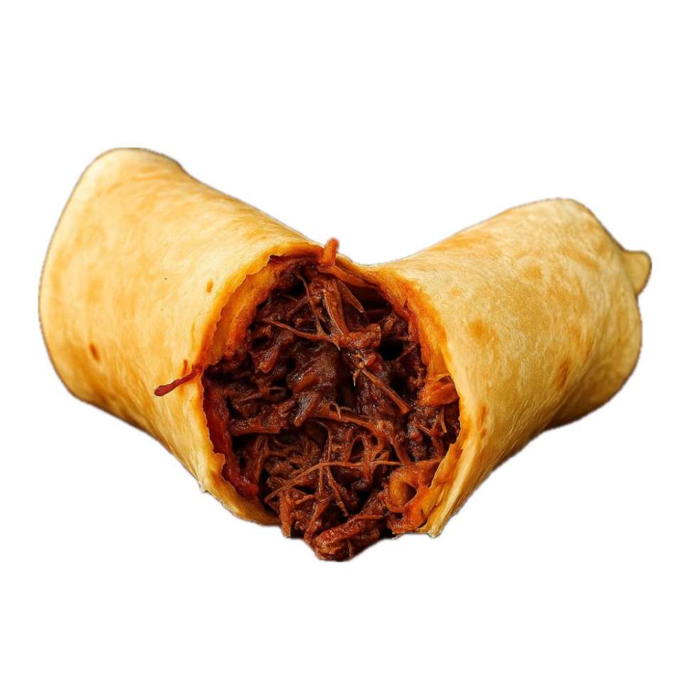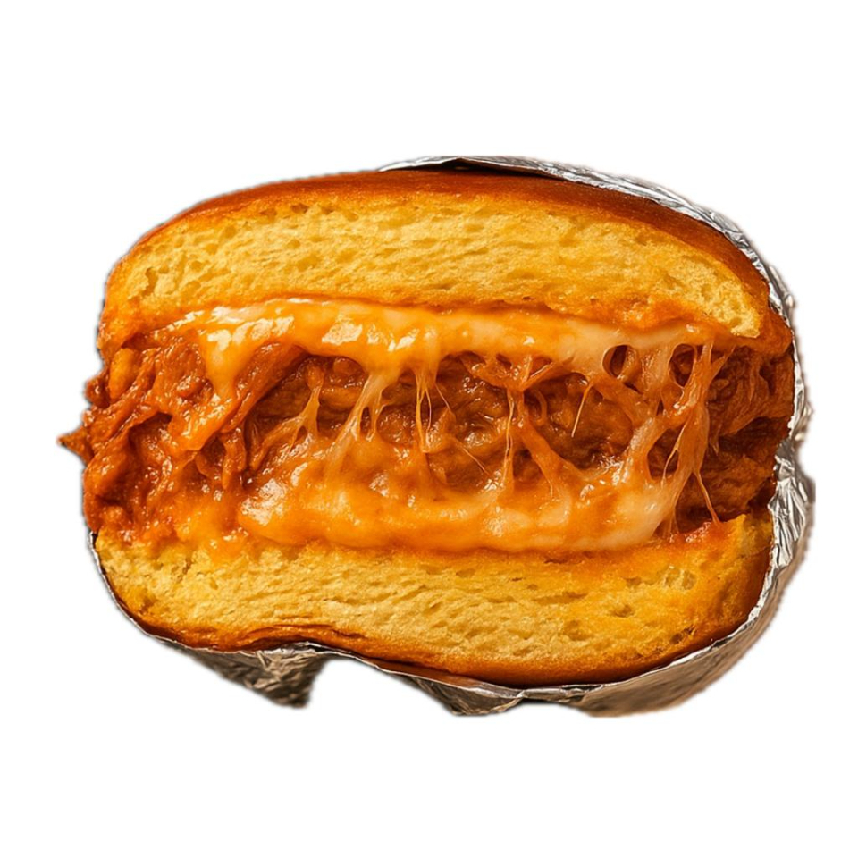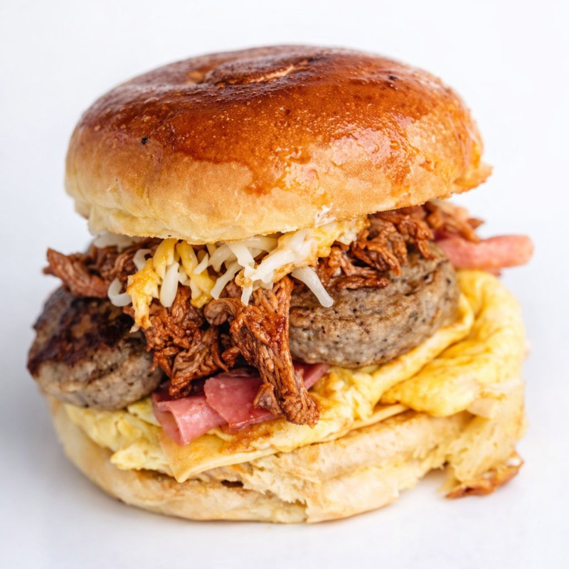 Huevo, queso americano, carne, tocino, desebrada y mix de queso