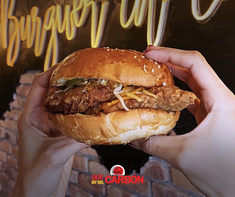 Carne 115 grs, tocino, lechuga, tomate, cebolla, pepinos, aderezos y queso amarillo.