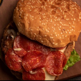Doble carne 115 grs tradicional, mayonesa, lechuga, tomate, cebolla, salsa italiana, pepperoni, queso manchego, queso asadero, pepinillos y tocino