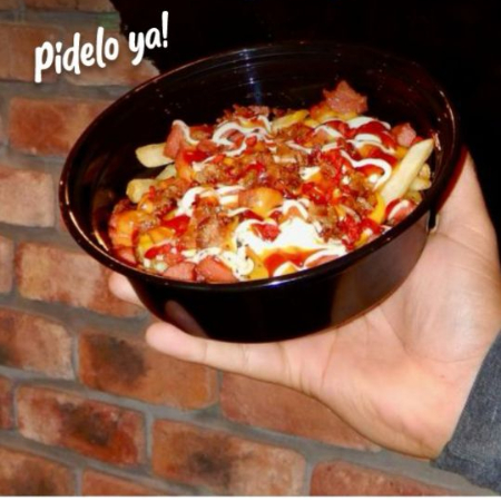 Doble carne sirloin o arrachera, tocino, queso amarillo, manchego, salsa italiana, pepperoni doble, jamón, salchicha polaca, 1/2 orden de papas fritas, 1 orden de aros de cebolla y aguacate.