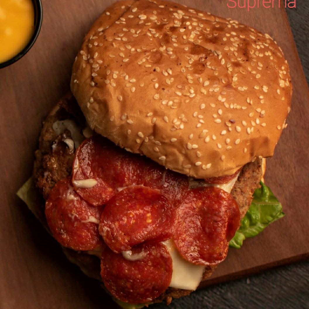 Doble carne 115 grs tradicional, mayonesa, lechuga, tomate, cebolla, salsa italiana, pepperoni, queso manchego, queso asadero, pepinillos y tocino