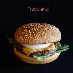 Carne 150 grs, lechuga, tomate, cebolla, pepino, queso amarillo, tocino y aderezos.