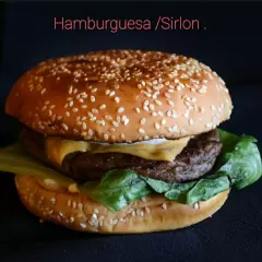 Sirloin o arrachera, lechuga, tomate, cebolla, pepinillo, queso amarillo, tocino, jamón, aros, papas fritas y aderezo de chipotle.