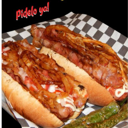 Salchicha de pavo jumbo acompañada de tocino,cebolla frita, tomate, cebolla, catsup, mayonesa, mostaza,