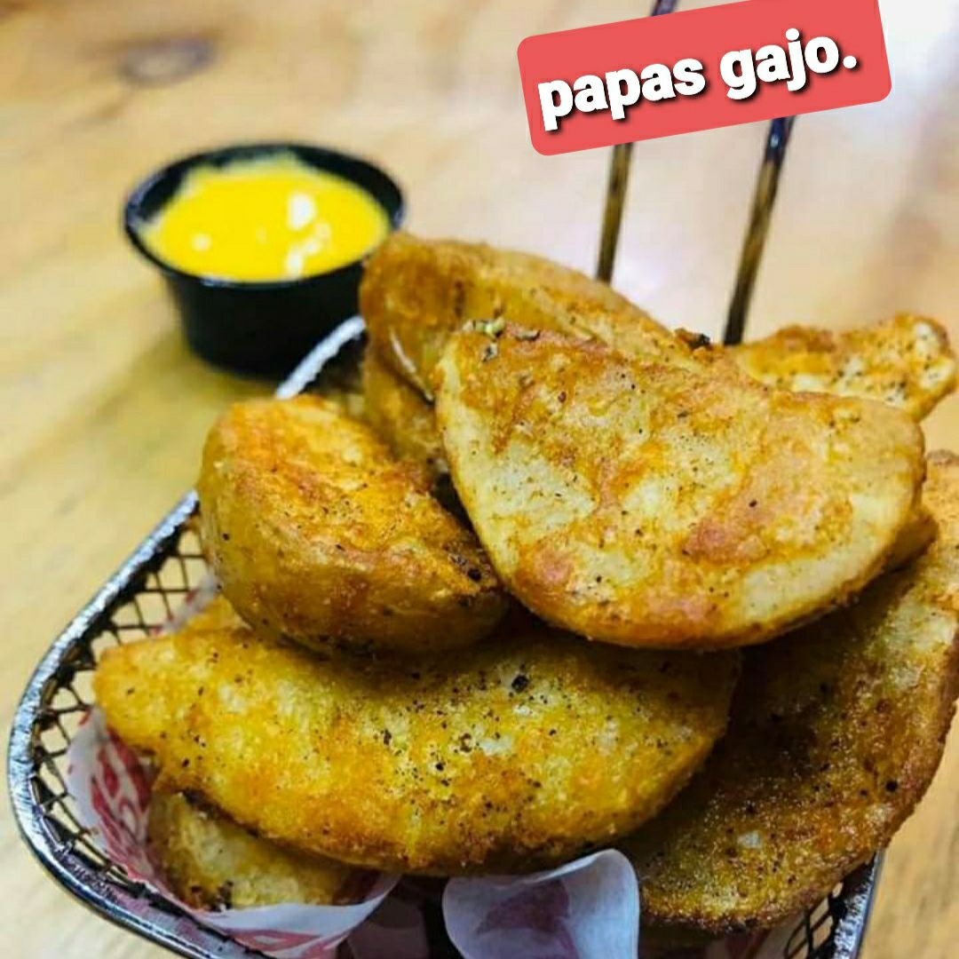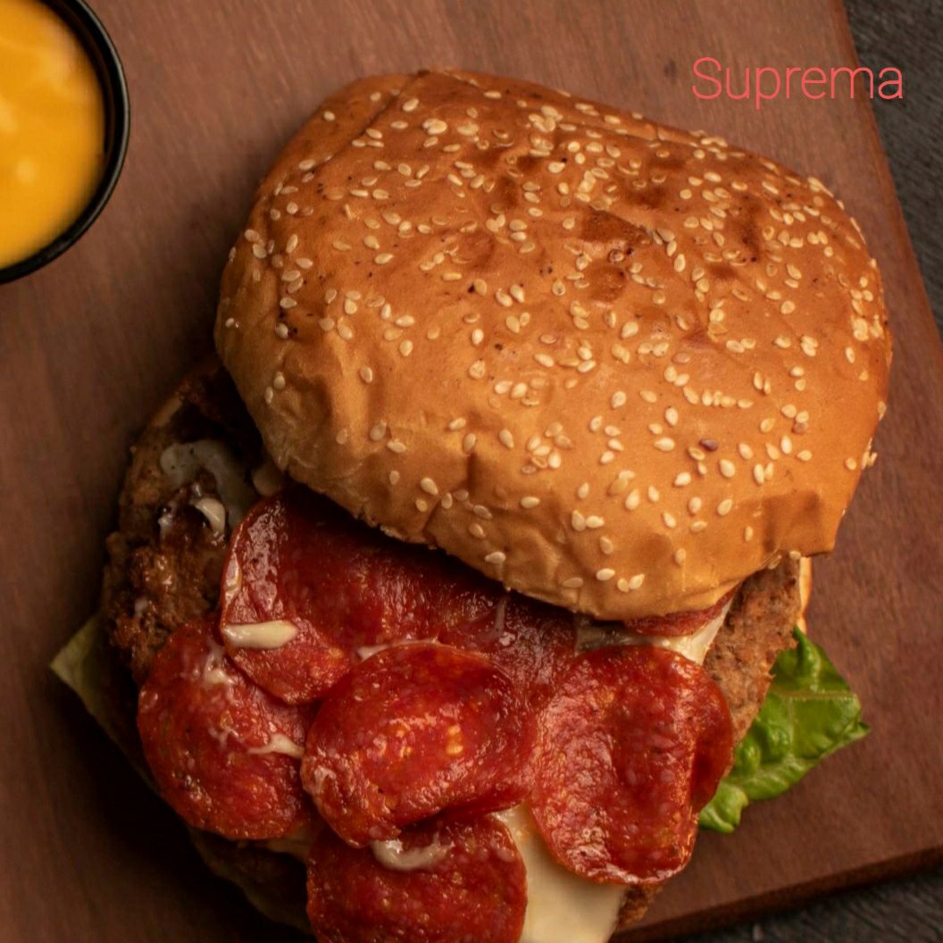 Doble carne 115 grs tradicional, mayonesa, lechuga, tomate, cebolla, salsa italiana, pepperoni, queso manchego, queso asadero, pepinillos y tocino