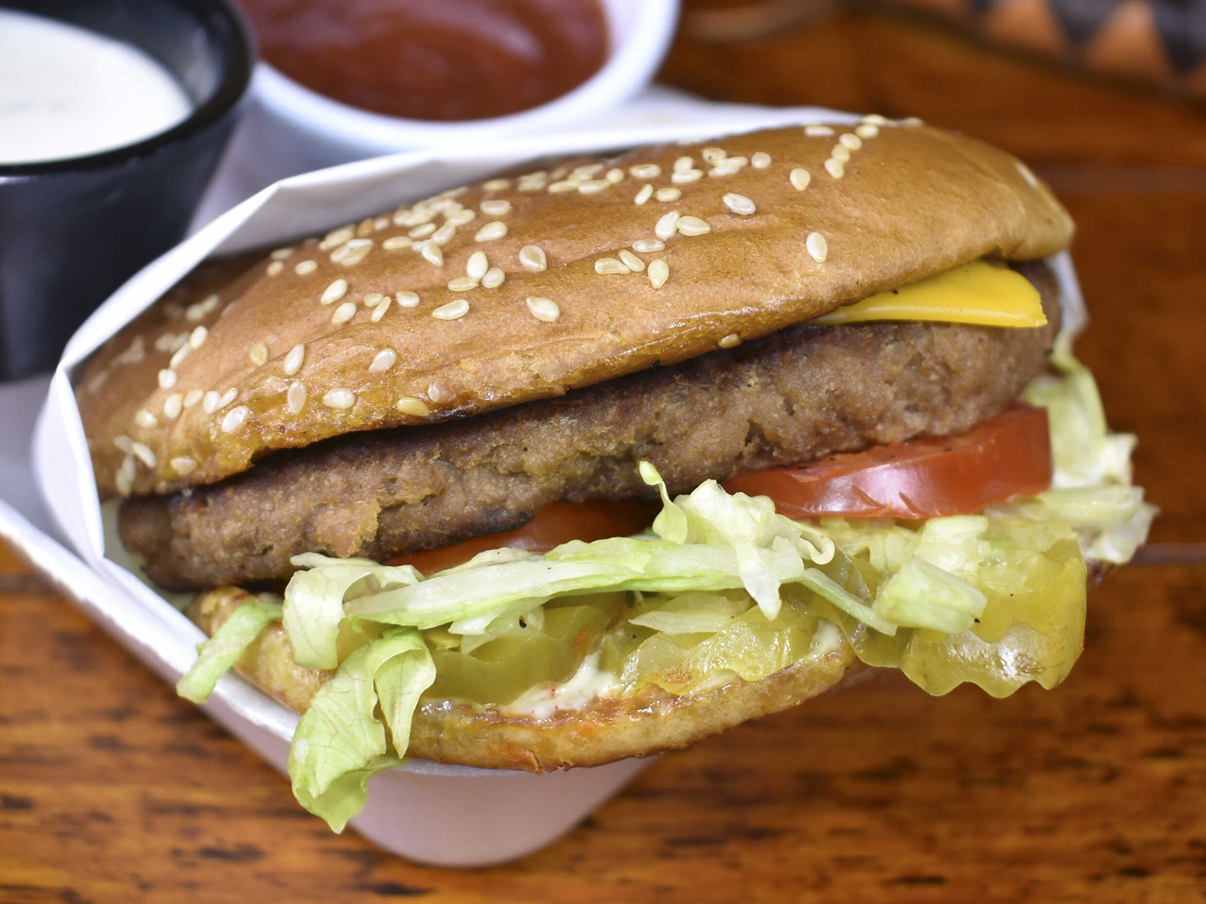 Carne de res, queso amarillo, lechuga, tomate, cebolla, pepinillos, mayonesa y mostaza