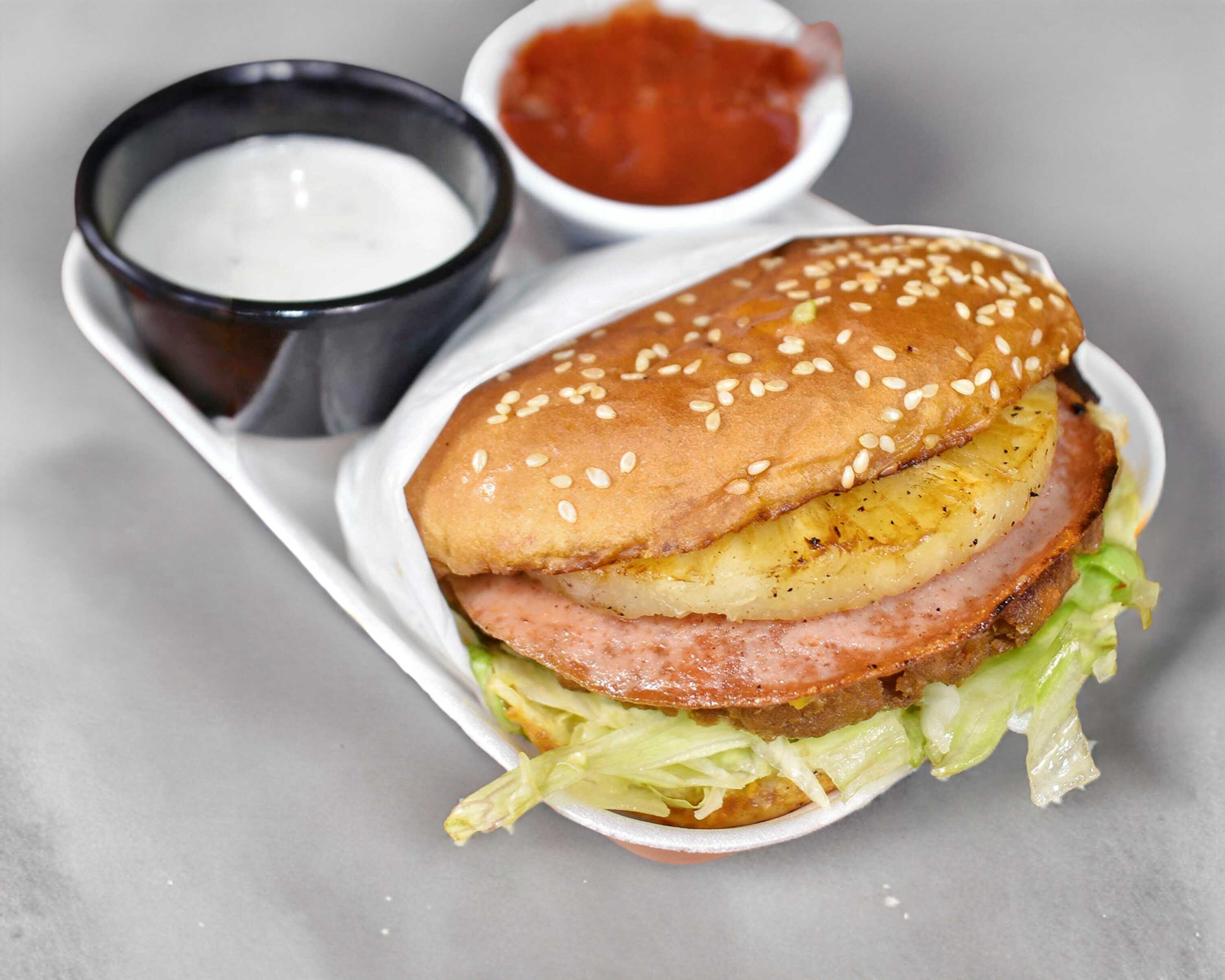 Carne de res, queso amarillo, jamón, piña asada, lechuga, mayonesa y mostaza