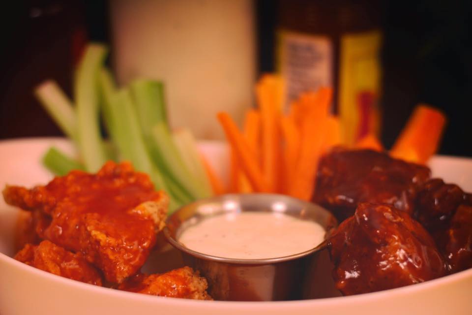 alitas en salsa bufalo, BBQ, mango habanero, pimienta limon, parmesano,bufalo-ranch
