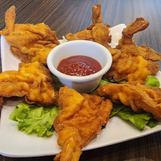 6 Camarones empanizados, rellenos de queso philadelphia.