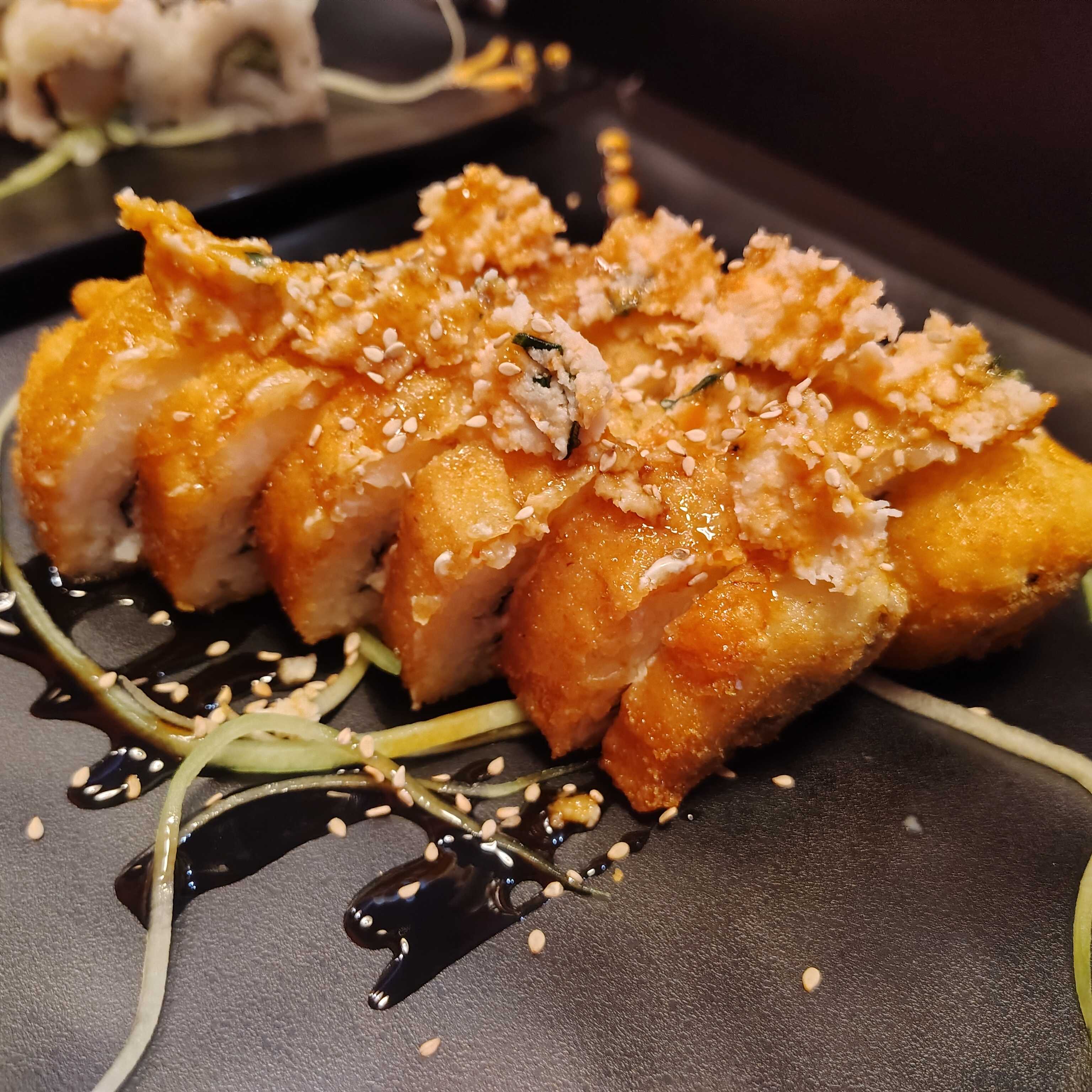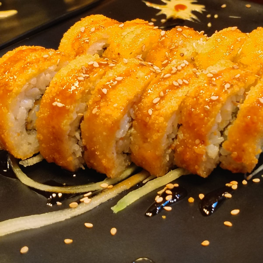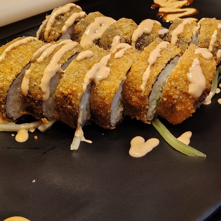 Arroz frito, camarones, filete de res, queso manchego y aguacate por dentro; empanizado con salsa chipotle por fuera.