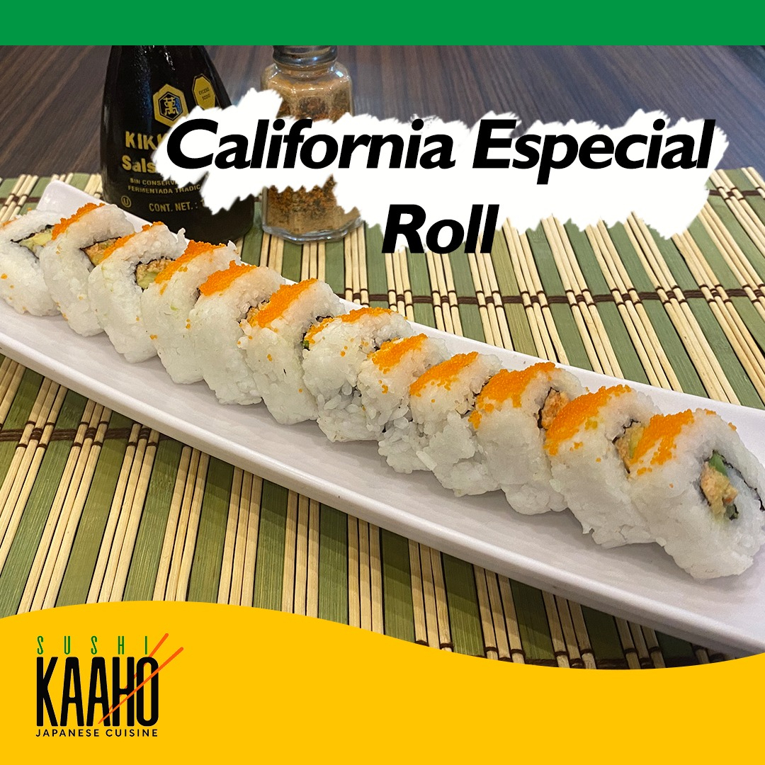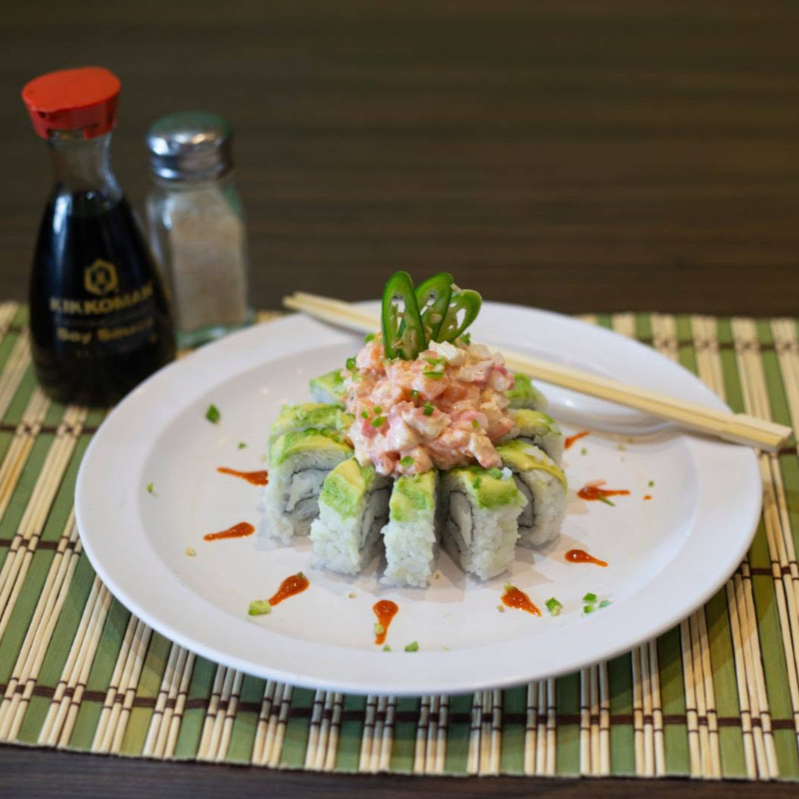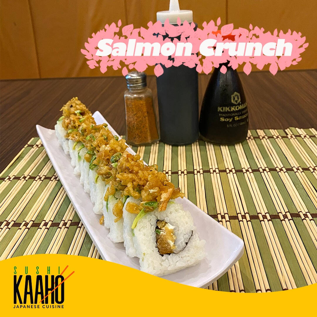 Salmón, aguacate, philadelphia, cebolla, chile serrano, pasta crunch, topping de masago y aguacate por fuera y topping de crunch.
