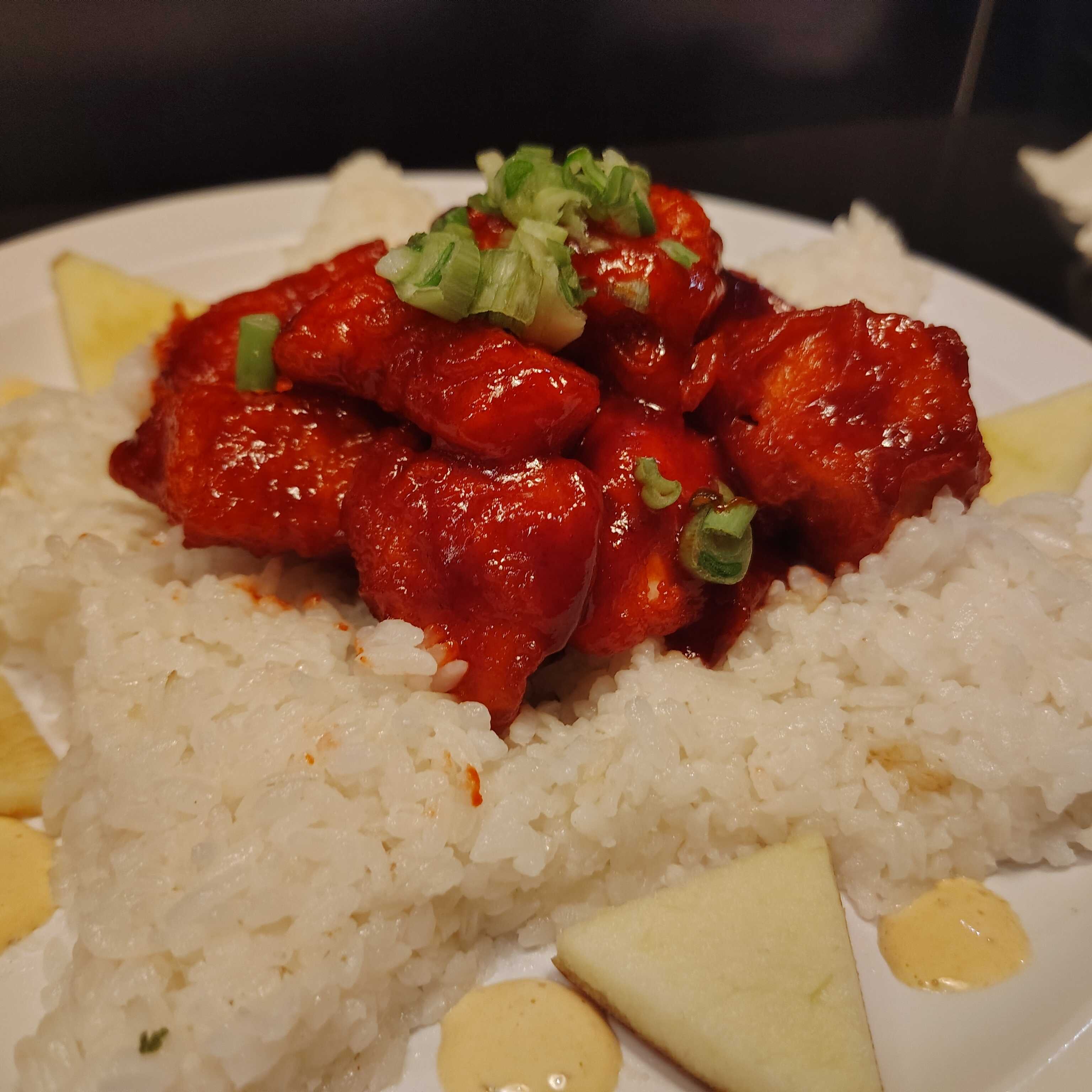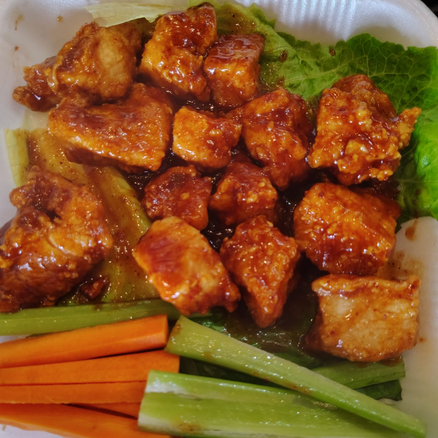 Cubos de pollo empanizado bañados con nuestra salsa agridulce; servido en una cama de arroz al vapor.