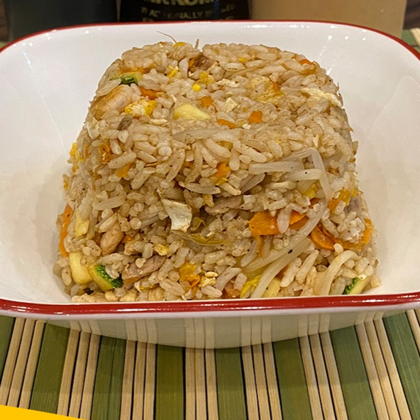 Arroz frito con zanahoria, calabazas, germen de soya, champiñones, huevo, filete de res, camarón y pechuga de pollo.