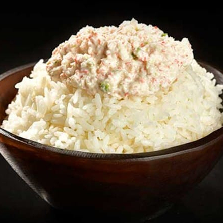 Tazón de arroz al vapor con Tampico, cebollín y ajonjolí.
