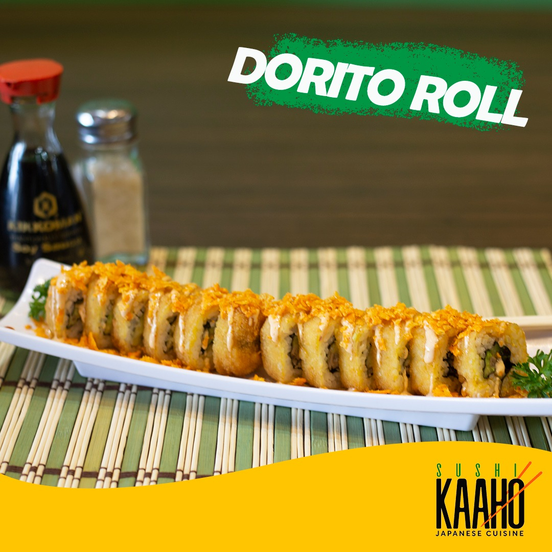 Camarones capeados, cebolla y cilantro por dentro, topping de aguacate, philadelphia, salsa chipotle, Doritos y cilantro encima.
