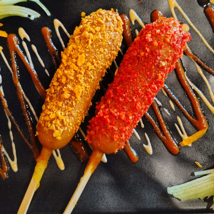 Salchicha bañada en miel envueltas en pasta de la casa, espolvoreadas en Flaming o Dorito