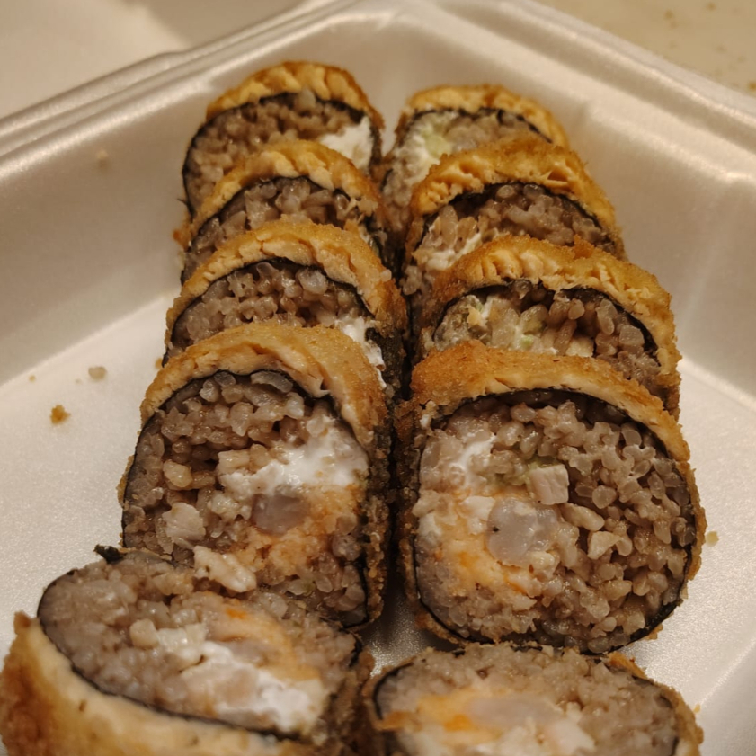 Arroz frito, pechuga de pollo, camarón, pasta tampico, aguacate y philadelphia por dentro; empanizado, ajonjolí.