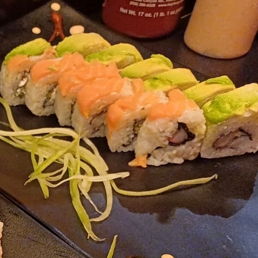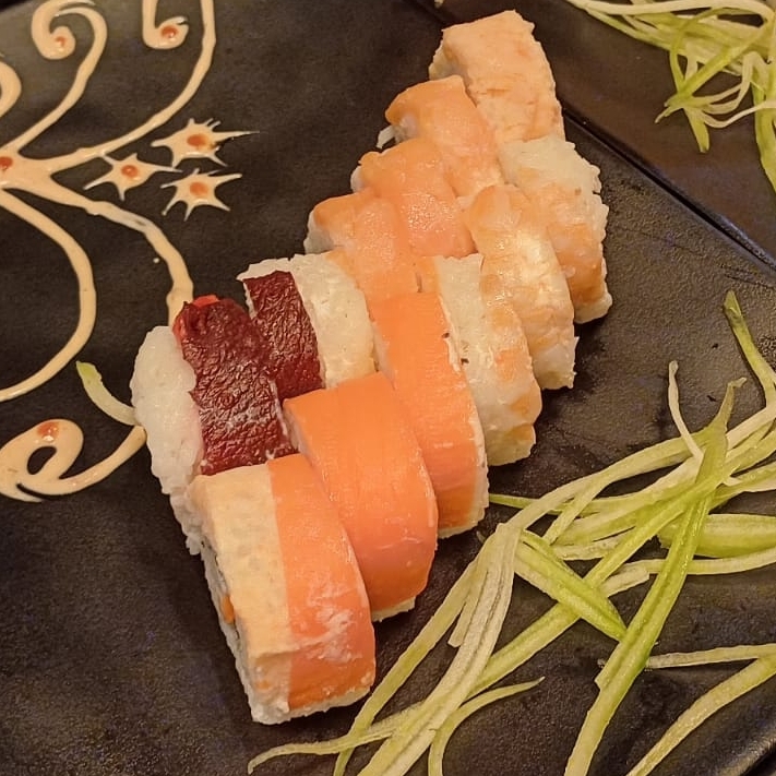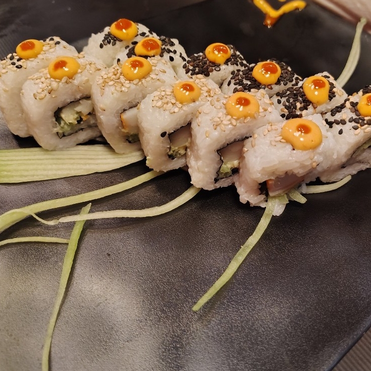Camarón, aguacate, philadelphia por dentro; salmón fresco por fuera, topping anguila y pasta Tampico, bañado con salsa especial.
