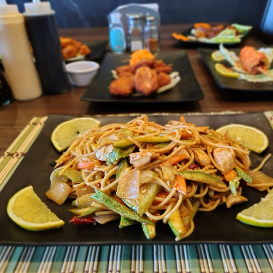 Tallarines japoneses, camarón, salmón, brócoli, coliflor y zanahoria.