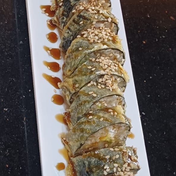 Cangrejo, aguacate, pulpo, aguacate, philadelphia por dentro; empanizado con salsa de anguila y ajonjolí.