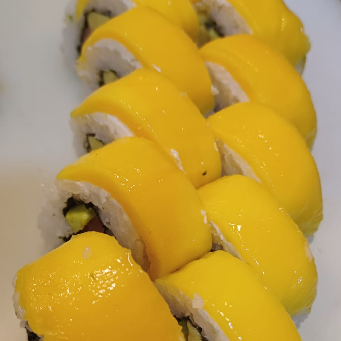Salmon fresco , aguacate y pepino por dentro: philadelphia y mango por fuera, bañados en salsa de tamarindo