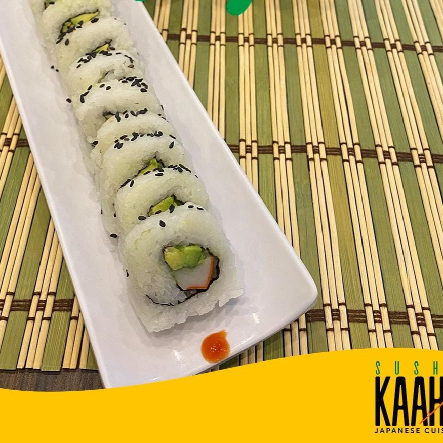 Pasta de cangrejo, aguacate, pepino por dentro; ajonjoli por fuera