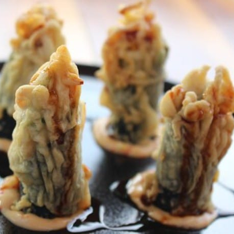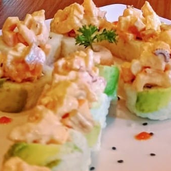 Camarones, aguacate philadelphia por dentro, empanizados acompañados con un topping de camarones y tsurimi con salsa chipotle y cebolla encima