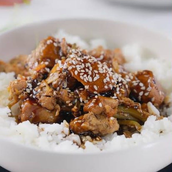 Cubos de pechuga de pollo bañada con nuestra salsa agridulce servido en una cama de arroz al vapor