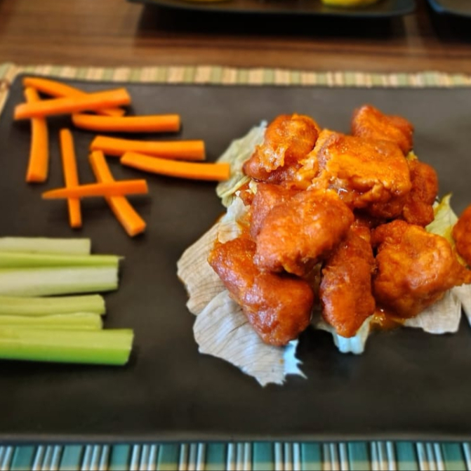 Cubos de pollo bañados en salsa buffalo