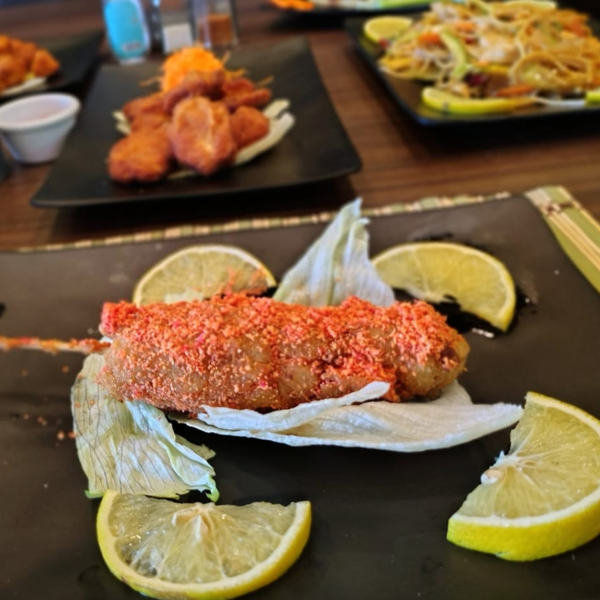 Carne al pastor, aguacate y queso manchego por dentro, empanizado con salsa de anguila spicy