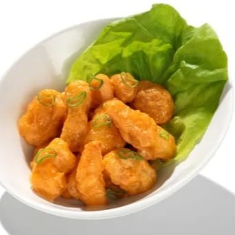 Camarones sazonados, capeados y bañados con una salsa con un toque de picante