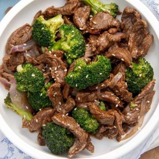 Carne de res y brócoli servido en una cama de arroz al vapor
