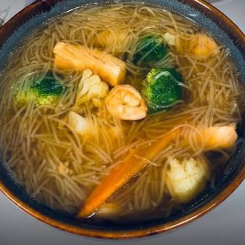 Tallarines japoneses, camarón, salmón, brócoli, coliflor y zanahoria